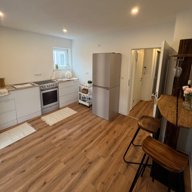 - helle Küche mit Zugang zum Esszimmer und zur Loggia
